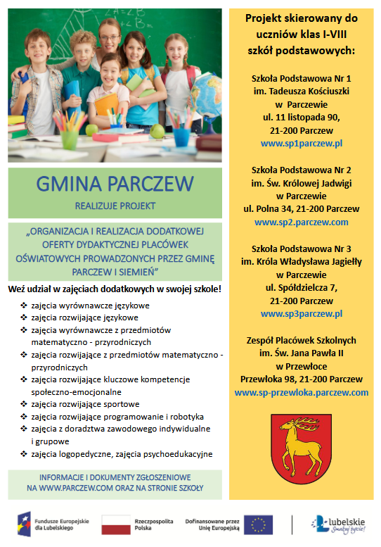 W związku z przystąpieniem Gminy Parczew do realizacji projektu „Organizacja i realizacja dodatkowej oferty dydaktycznej placówek oświatowych prowadzonych przez Gminę Parczew i Siemień” nr wniosku FELU.10.05-IZ.00-0016/25, dofinansowanie ze środków Europejskiego Funduszu Społecznego Plus w ramach programu Fundusze Europejskie dla Lubelskiego 2021-2027 informujemy o prowadzonej rekrutacji na zajęcia dodatkowe dla uczniów.